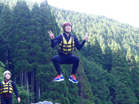 途中からは青空になってサイッコーのラフティング日和の中、今日のお客さんたちを担当したガイドはー